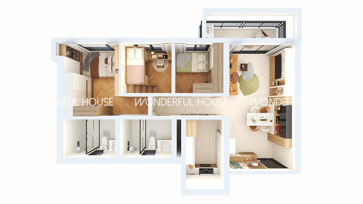 成個戶型布局方正,三間睡房同公共區域完全分開,動線流暢唔會亂,仲有兩個獨立衛生間,早上返工返學唔使爭廁所,客廳連接露台採光充足,廚房同餐區銜接順手,每一寸空間都用到盡。