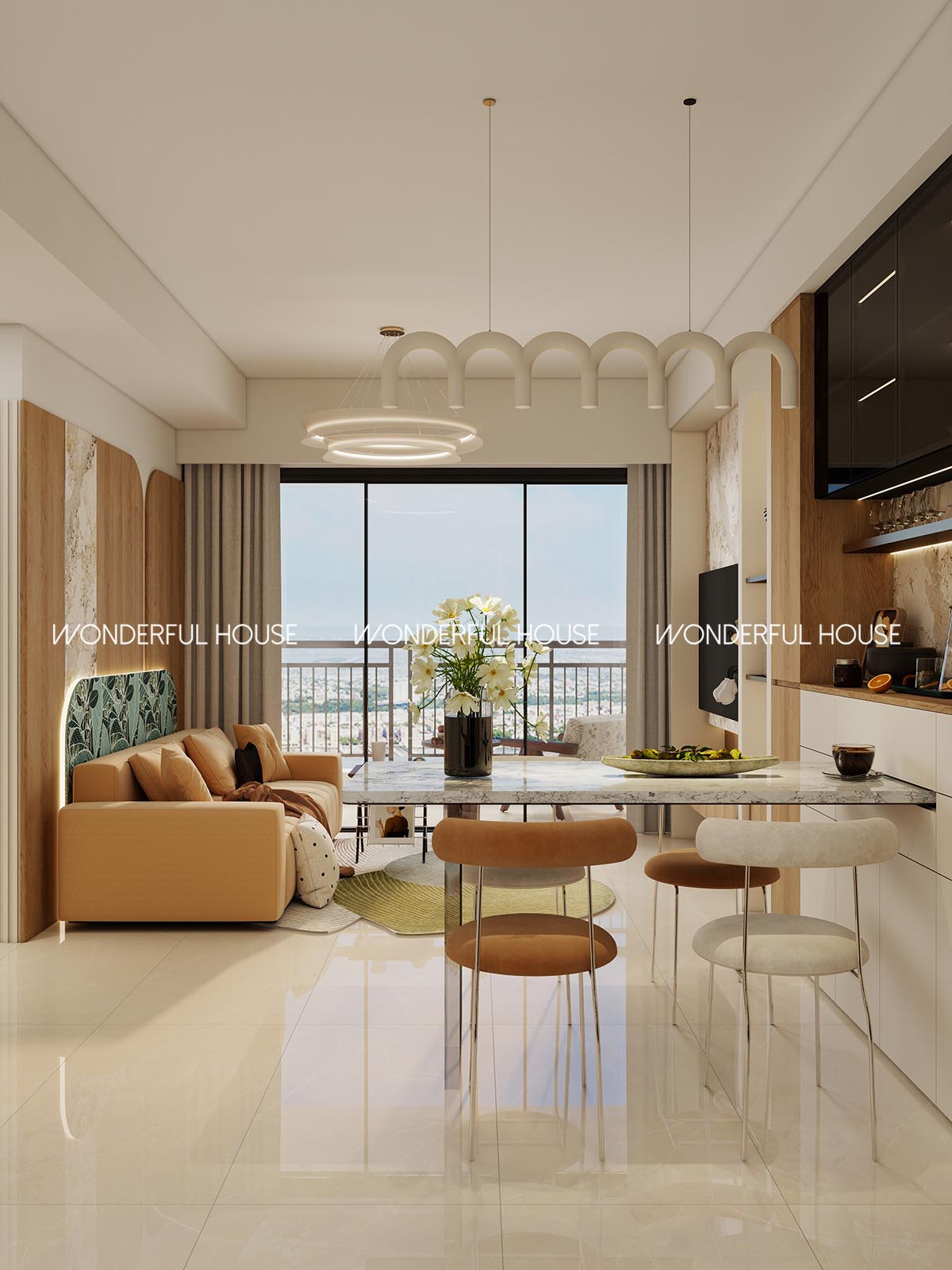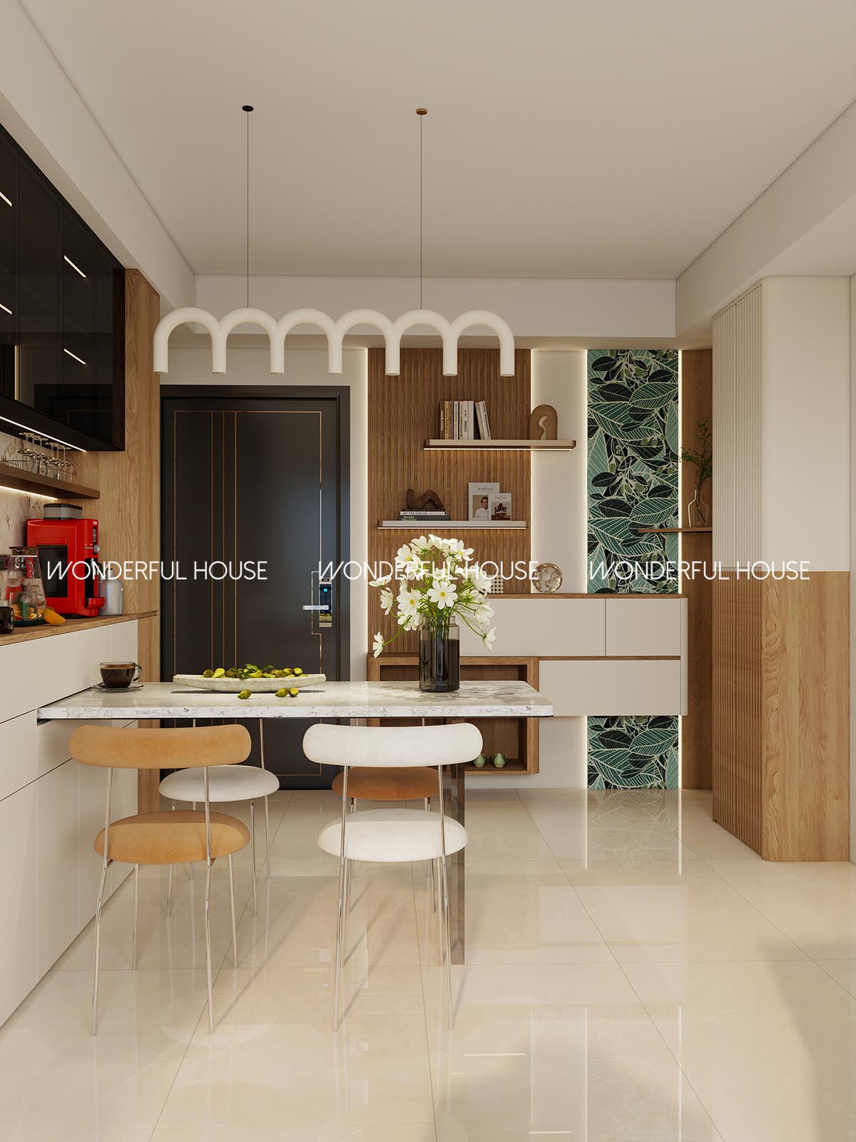 餐區 M 型藝術吊燈設計感滿分,旁邊玄關收納整齊,一邊吃飯一邊睇到窗外景色,氛圍感拉滿,岩板台面防刮防油,污跡一抹就乾淨,日常打理超方便。