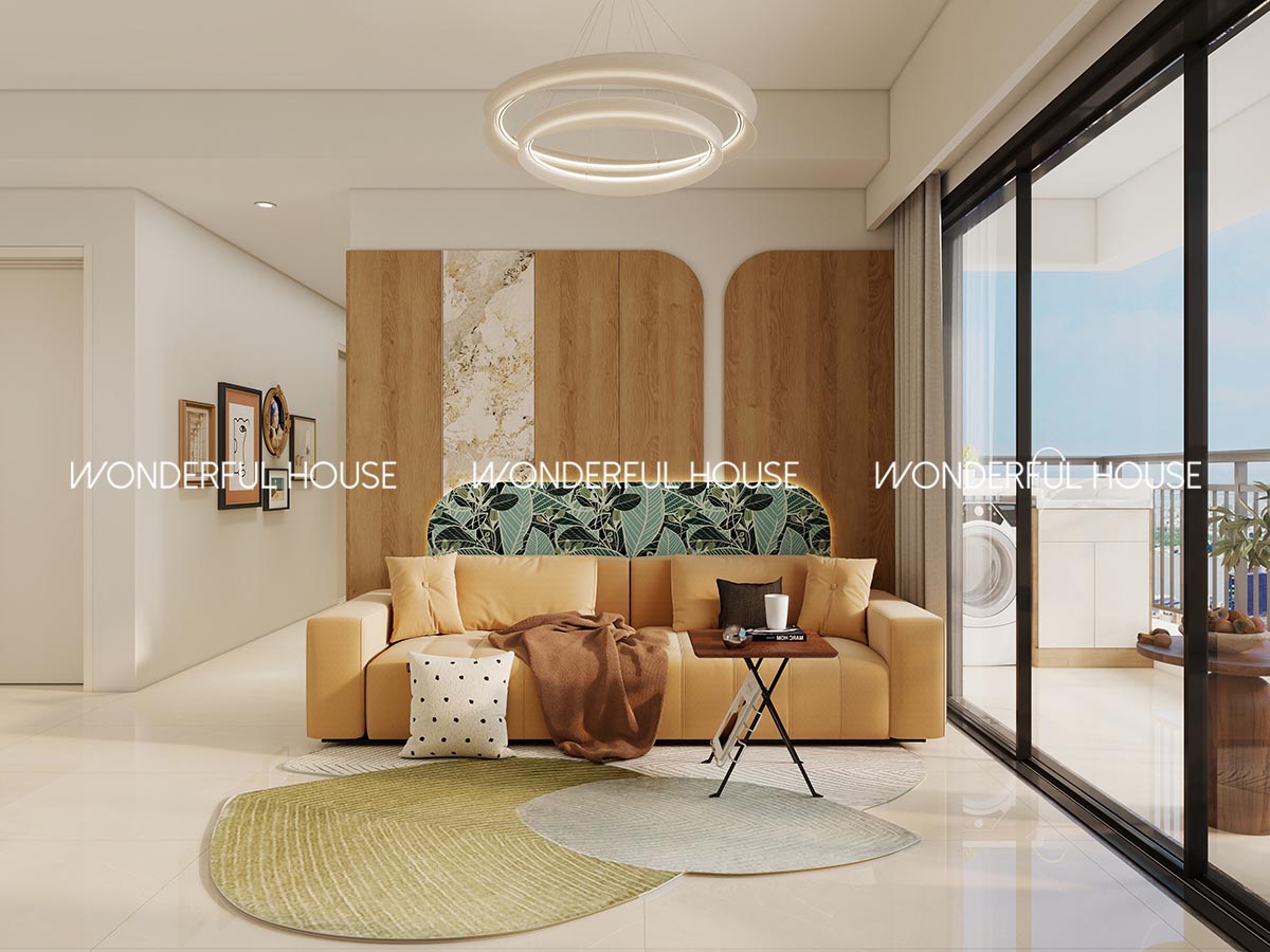 梳化選用柔軟嘅暖橙色面料,對住落地大窗採光超正,平時下班返屋企攤梳化睇下電視、吹下露台嘅風,一日疲勞都散晒,背景牆用木紋搭配墨綠葉紋軟包,柔和舒適唔會冷冰冰。