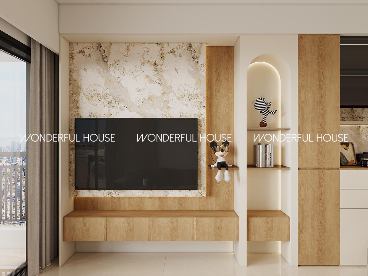 電視牆用奢石紋飾面搭配淺原木懸浮櫃,弧形開放格可以擺裝飾品同小朋友嘅玩具,密封櫃收納遙控、雜物,底部懸浮設計清潔掃地都冇死角,線條簡潔大氣,睇幾耐都唔會膩。