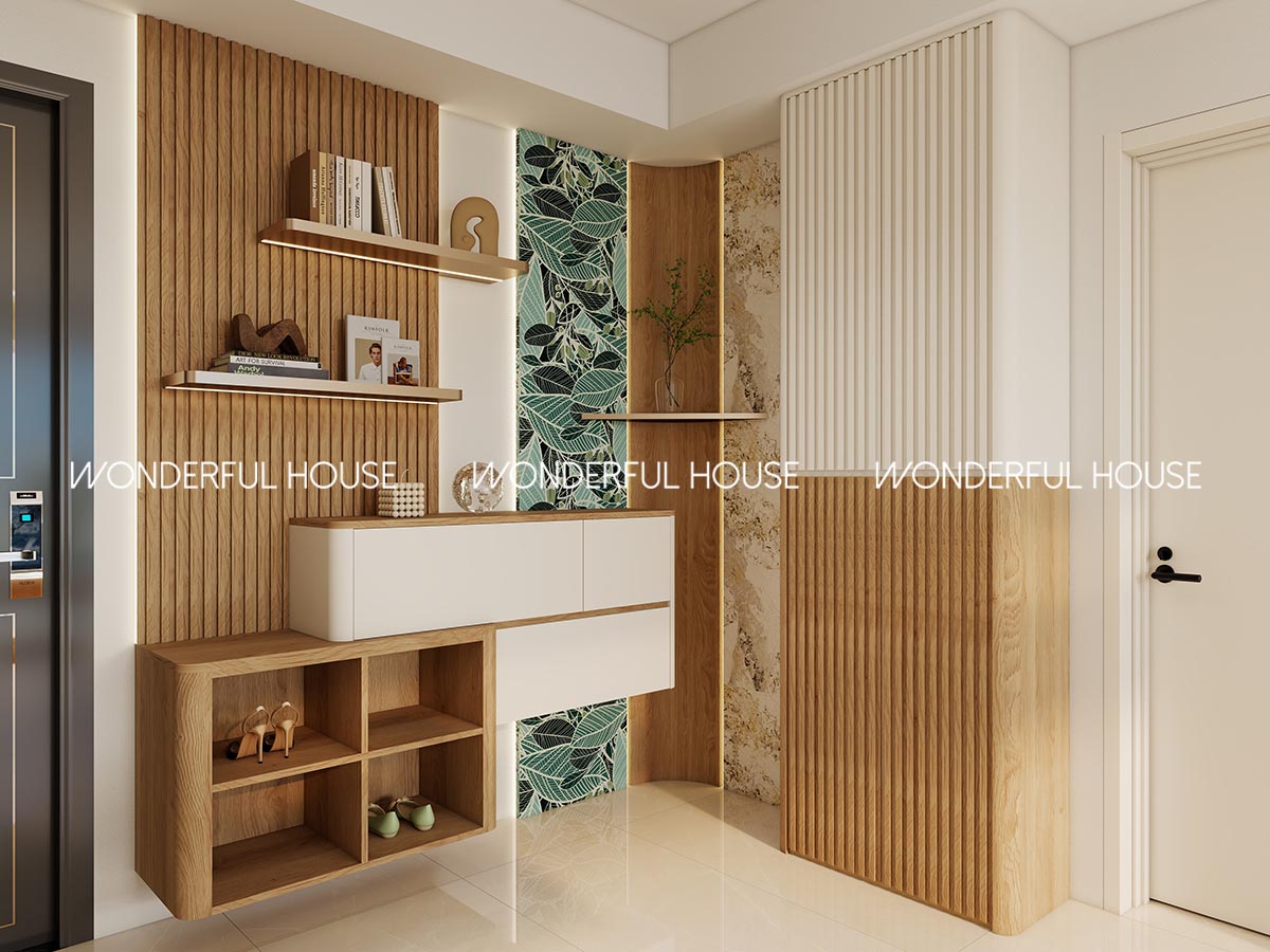 玄關做木格柵背景牆搭配墨綠植物花磚,柔和燈帶點綴質感十足,懸浮鞋櫃開放格擺放日常常穿鞋,密封收納區收換季鞋履、雨傘等雜物,開放層板可以擺裝飾品同小雜物,入屋就整整齊齊,完全唔會有雜物亂放嘅煩惱。