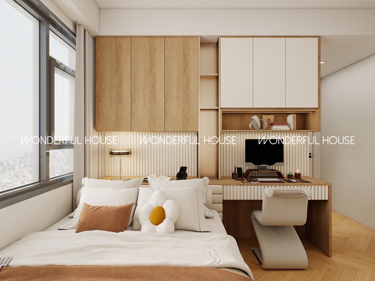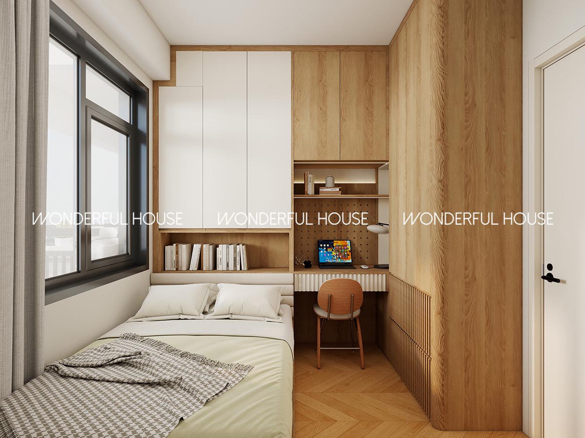 呢間房做床 + 書桌一體訂造,到頂衣櫃收納四季衣物完全夠用,床側延伸嘅書桌對住窗邊自然光,無論係用作客房、居家返工書房,甚至以後改做琴房、興趣房都好靈活,完全匹配家庭不同階段嘅需求。