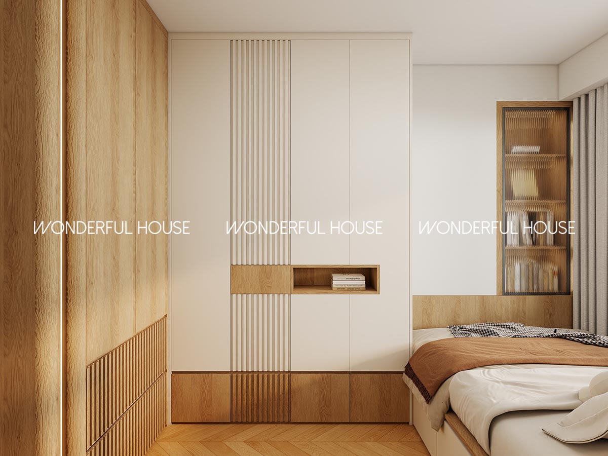 主人房做整面到頂訂造衣櫃,開放格同密封櫃結合,四季衣物、被鋪都有位置放,隱藏燈帶設計夜晚拿衫都夠光,唔使開大燈嘈醒另一半,地台床柔軟舒適,淺木 + 奶白配色柔和,瞓覺都特別放鬆。