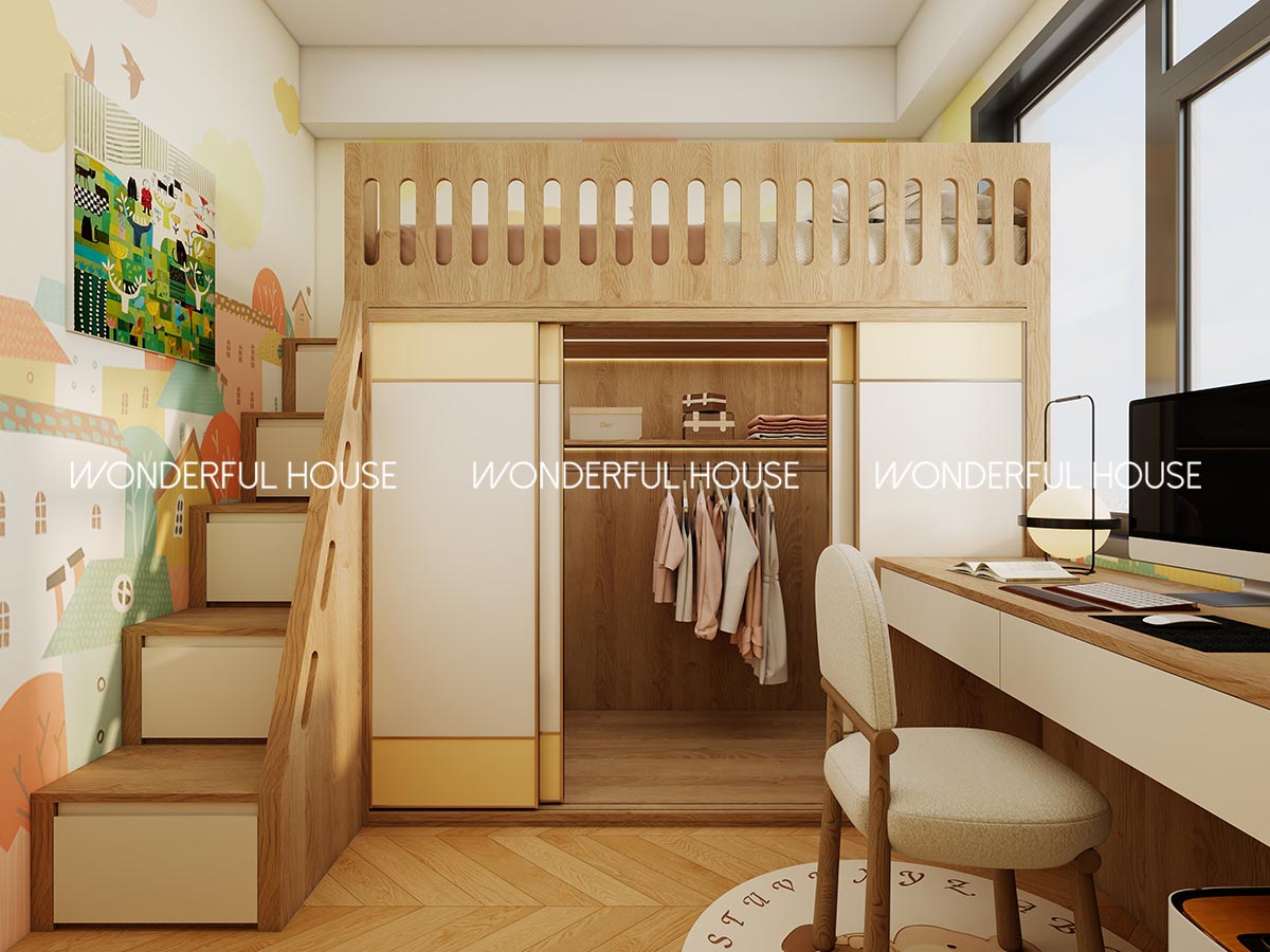 兒童房採用複合高低床設計,上層係睡眠區帶安全護欄夠放心,下層內嵌衣櫃收納小朋友嘅衣服、玩具,旁邊連接獨立書桌,做功課、畫畫都有專屬位置,樓梯踏步仲做隱藏收納,細小雜物都可以收埋,童趣牆紙配色柔和,小朋友大咗都適用。