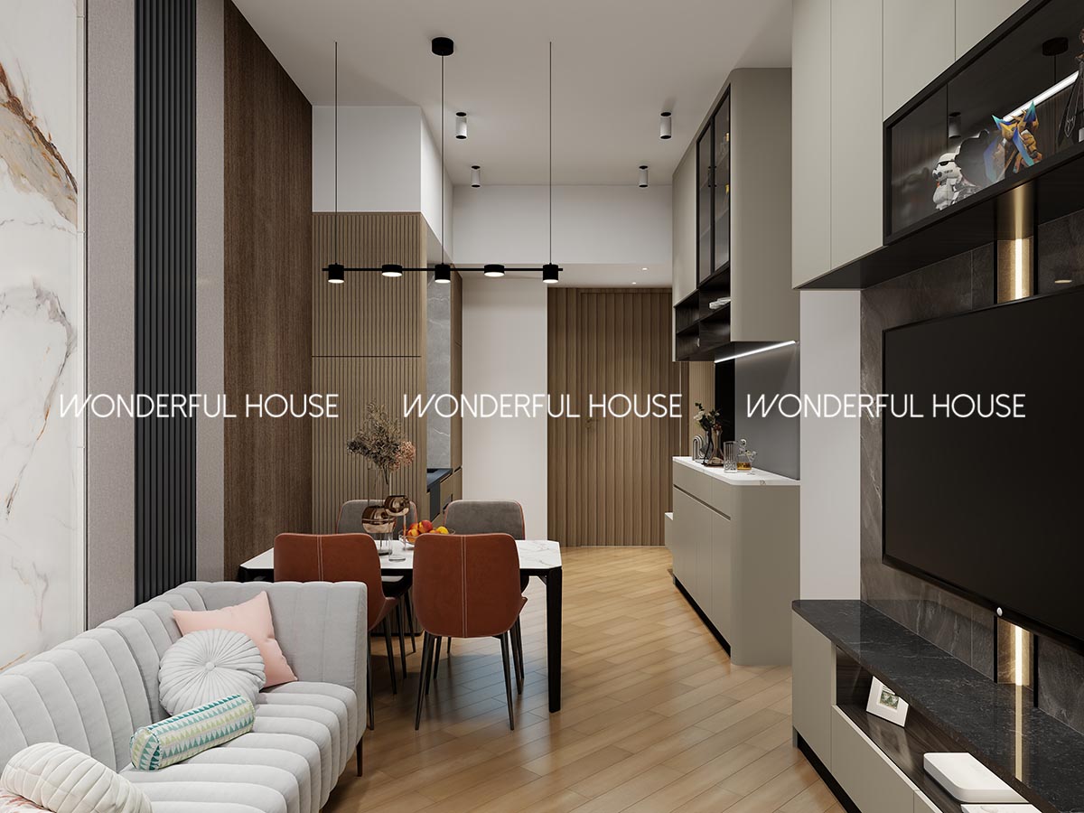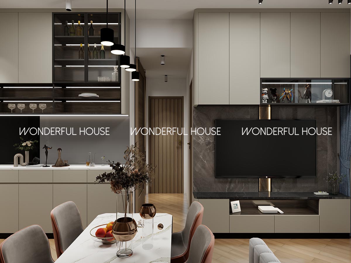 餐邊櫃做一體化設計,預留嵌入式酒架 + 冰吧位,周末約朋友打邊爐、小酌都超方便,懸浮吊燈夜晚開燈氛圍感直接拉滿。