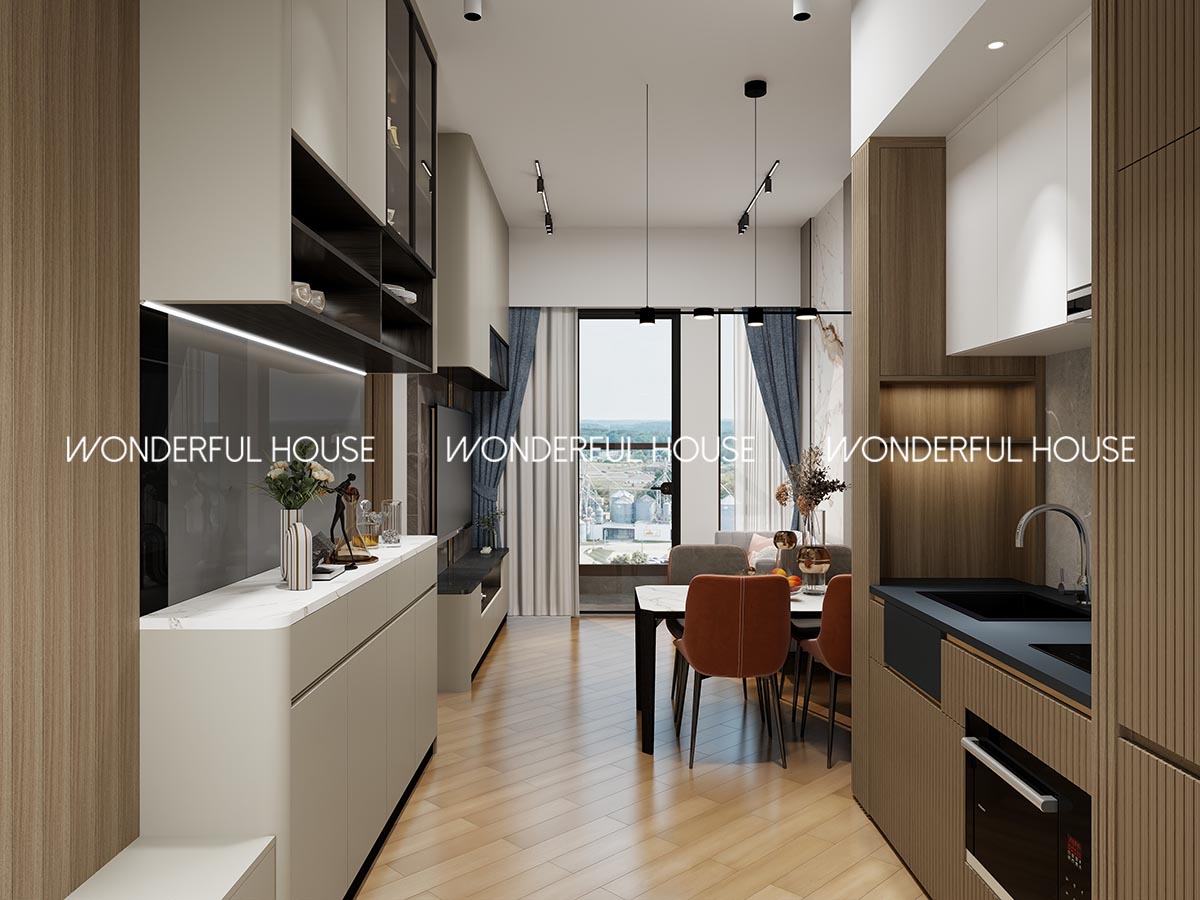 開放式廚房用防油煙啞光石英石台面,油污一抹就乾淨,隱藏式拉手設計唔怕刮到小朋友,長條地磚對正落地玻璃窗,煮飯時候睇外景心情都靚啲