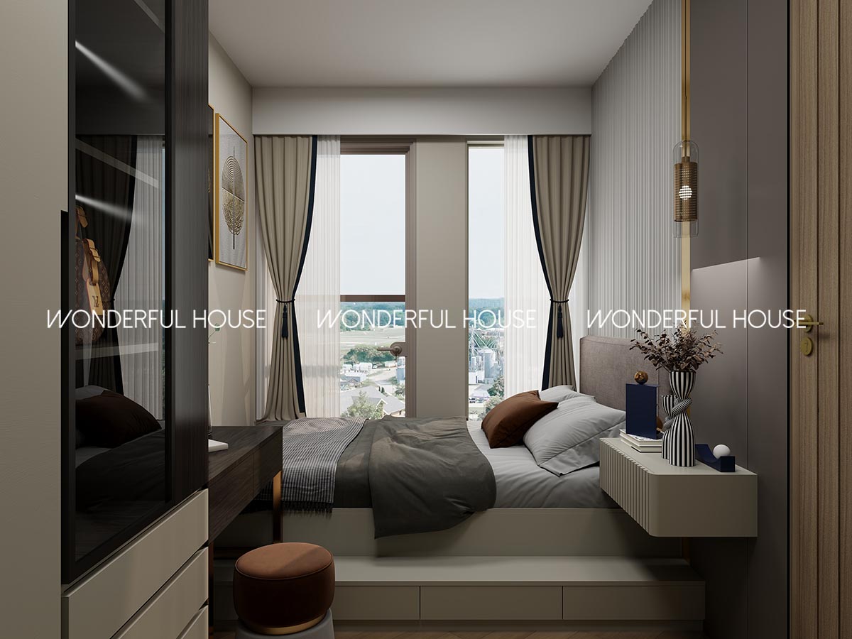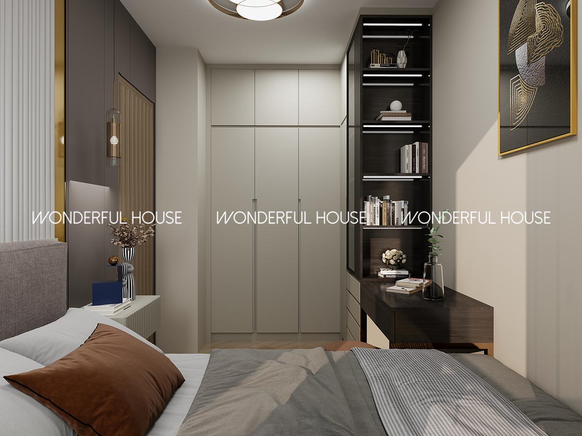 床頭用軟包背景牆 + 金屬線條點綴,搭配感應床頭燈,夜晚起身唔使開大燈晃眼,牆身額外加鋪隔音棉,關門就完全靜曬,瞓覺超安穩
