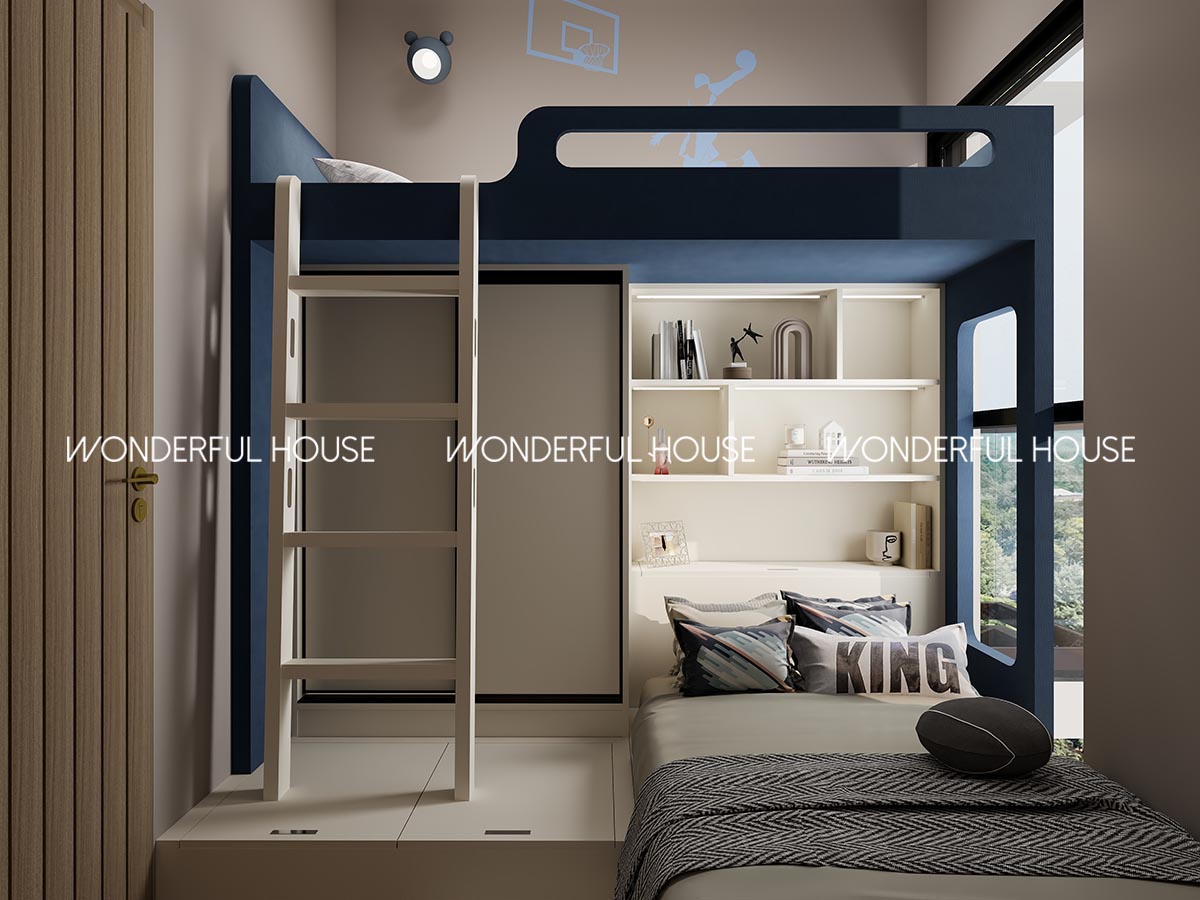 收納格夠塞晒小朋友的玩具、課本、運動裝備,牆身做籃球主題環保乳膠漆,符合小朋友喜好,用 E0 級板材冇異味,夠安全。
