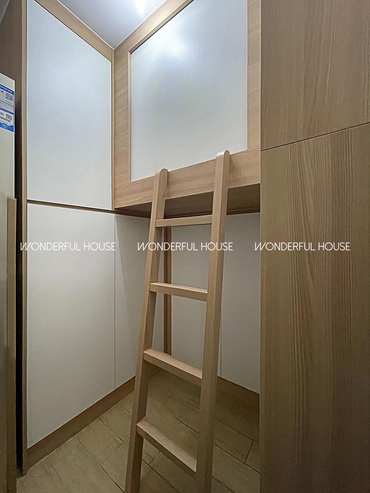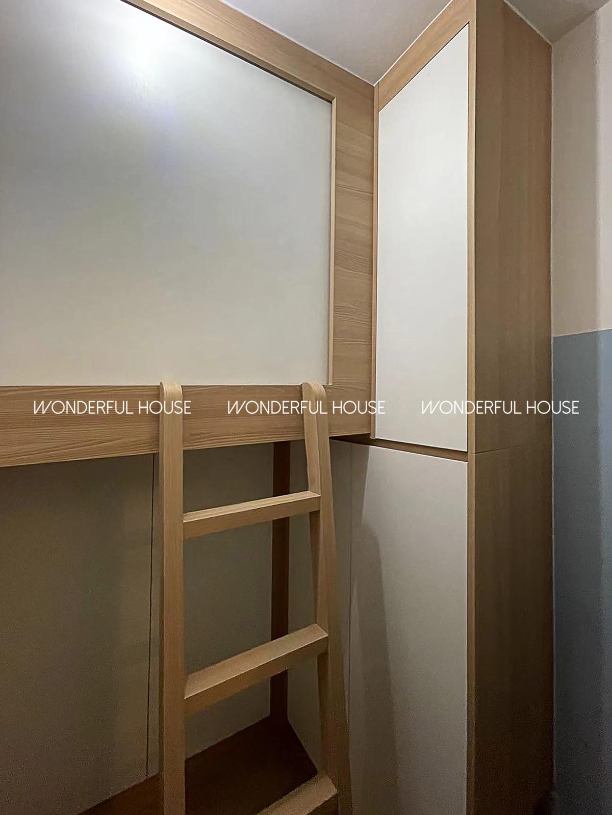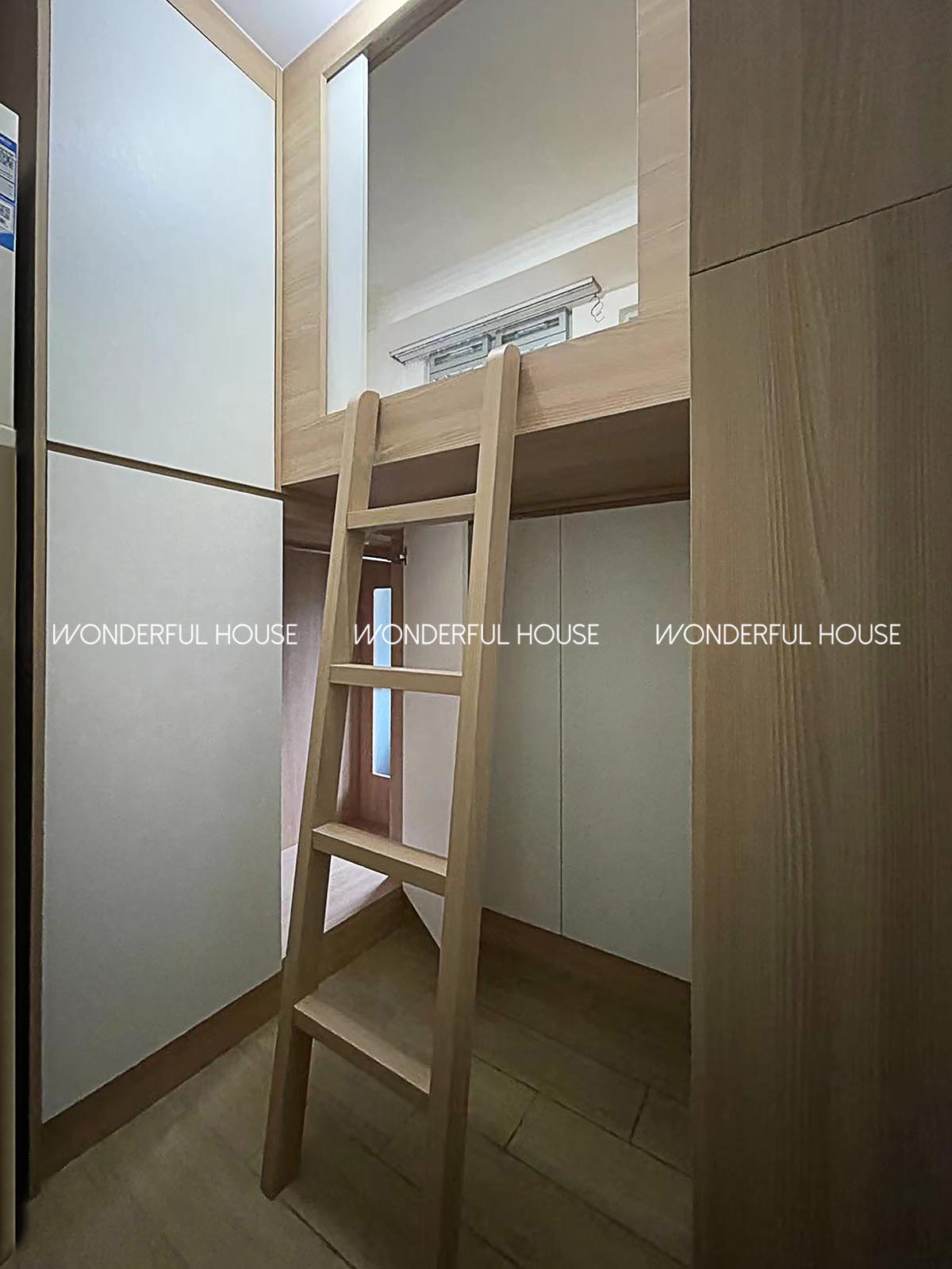 👉 高架床 + 嵌入式側櫃設計:上層做睡區,下層同側邊全部係隱藏收納,就連轉角死角位都用到盡,木質板材厚實防滑,梯級穩陣唔會搖,用 10 年都唔會鬆脫變形。