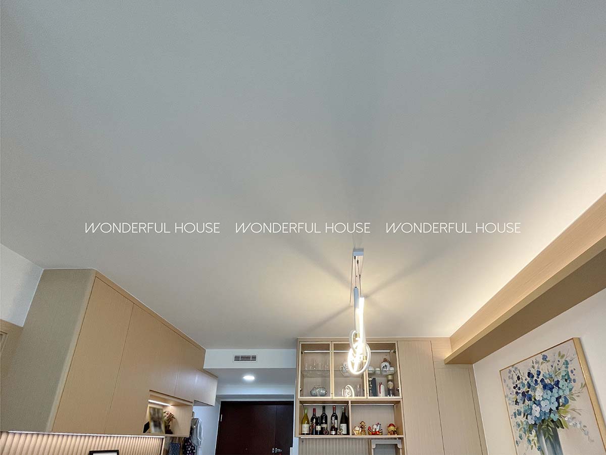 基礎工程是居家品質的底氣,這套項目在細節上可謂盡顯匠心。天花板採用平整順滑的設計,沒有多餘線條雜亂視覺,燈槽與頂面銜接處做到「無縫銜接」,不僅避免積灰問題,更讓空間顯得通透開闊。批牆環節則選用高品質材料,反覆打磨至牆面細膩無顆粒,光影下不見凹凸痕跡,日後無論貼牆紙還是刷漆,都能保持長久平整,杜絕開裂、掉皮的困擾。