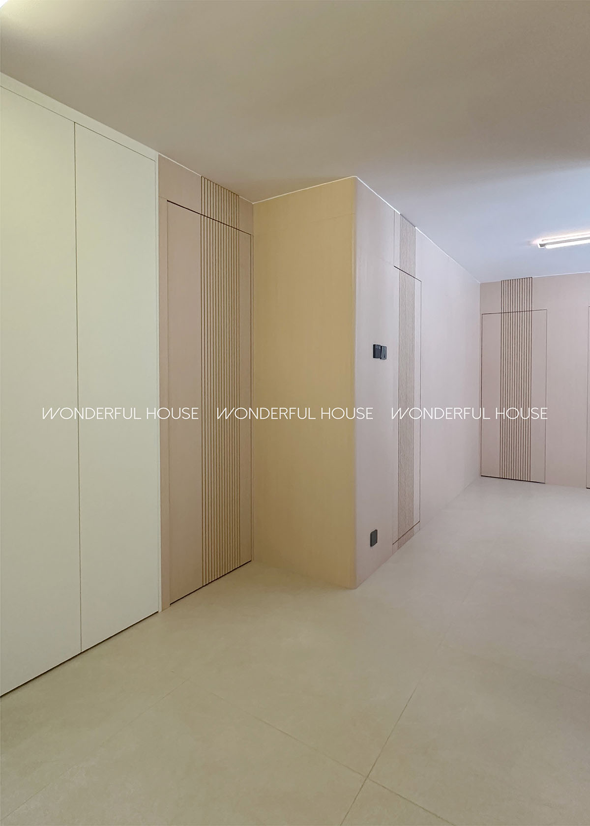 - 走廊+客廳隱藏櫃:櫃門同牆身同色,木紋飾面融入牆體,雜物藏好後,空間更整潔。